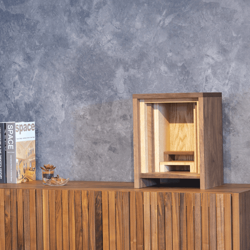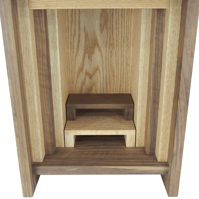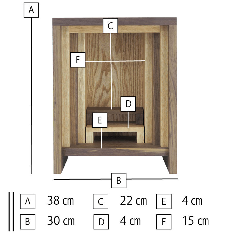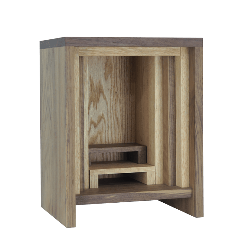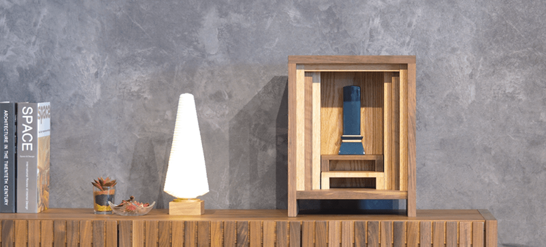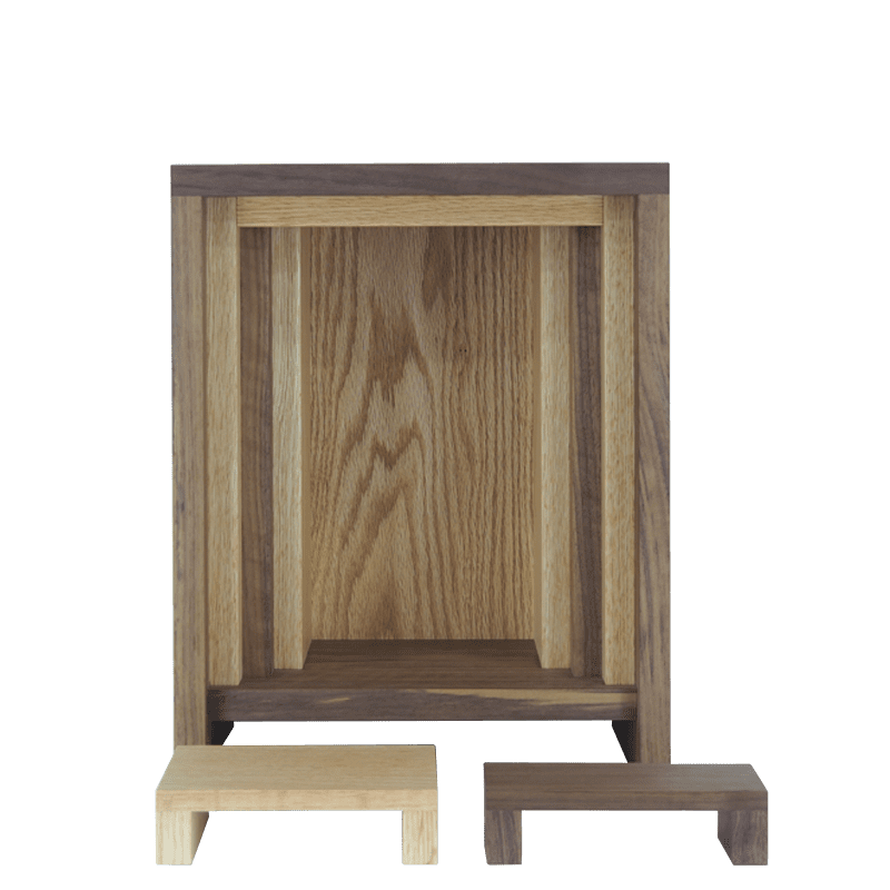 ウォールナットとオークの無垢材をふんだんに使用した現代の祈りのスタイルに合わせたパーソナル供養壇。2色のカラーが寄り添いインテリアの様な空間を造り、奥行を持たせる見た目で、遠近感や立体感をおしゃれに表現されたデザインです。