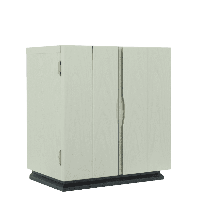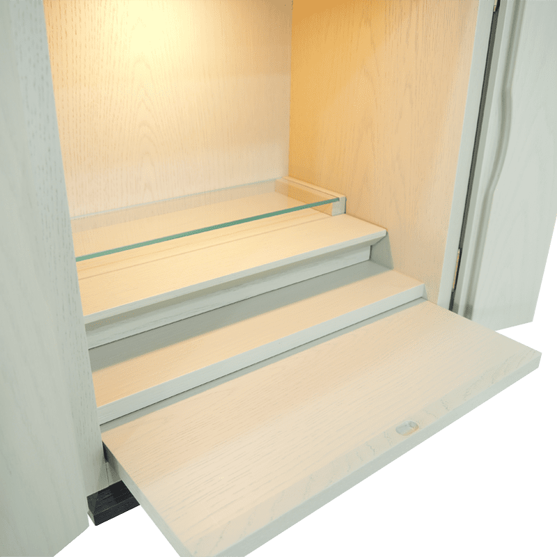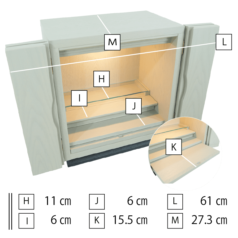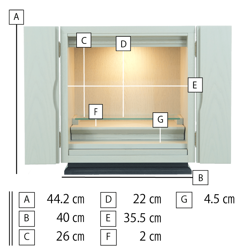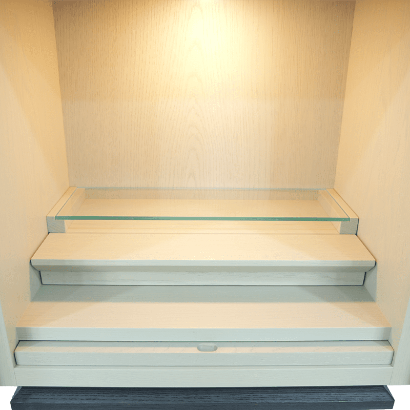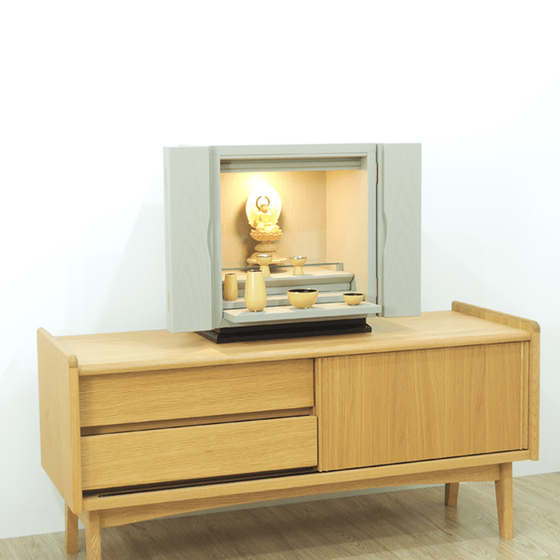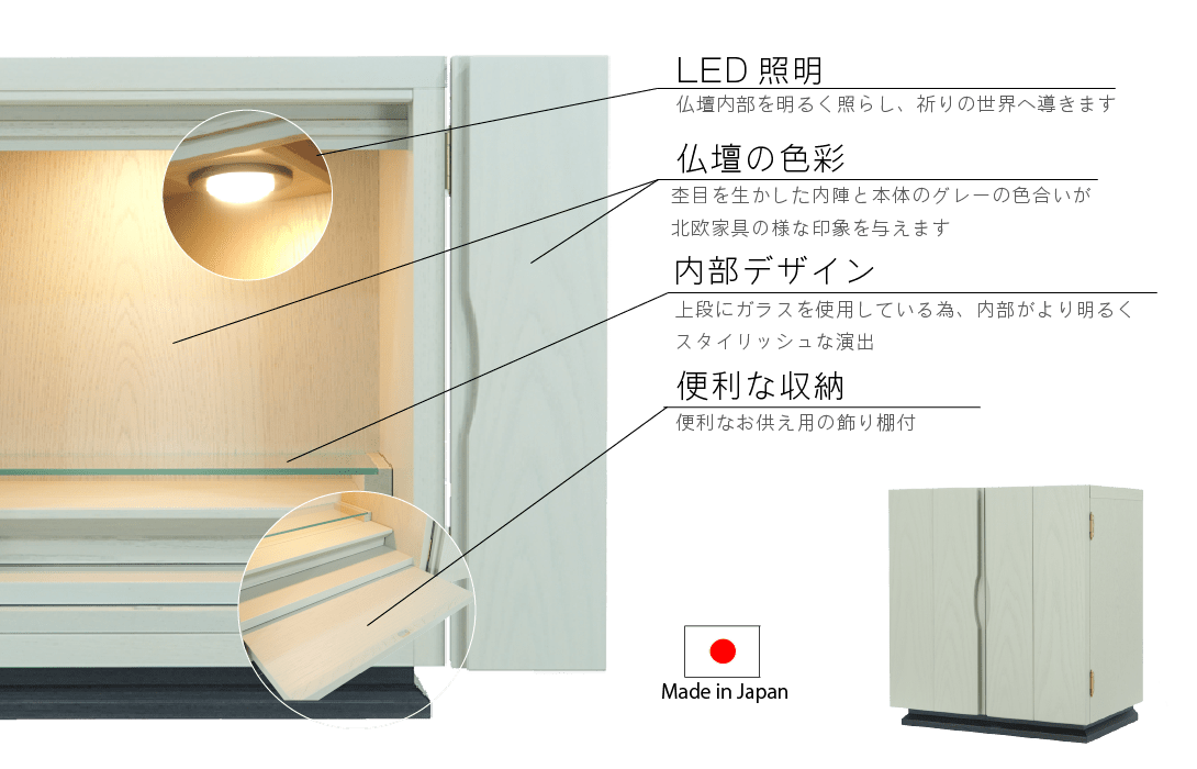 杢目を生かした内陣と本体のグレーの色合いが、北欧家具の様な印象を与えます。上段にはガラスを使用しているので、LEDライトが反射し内部を明るく照らし出し、おしゃれな祈りの空間を演出します。新ジャンルの仏壇で、めずらしい色彩は、現代のおしゃれな住宅にフィットします。