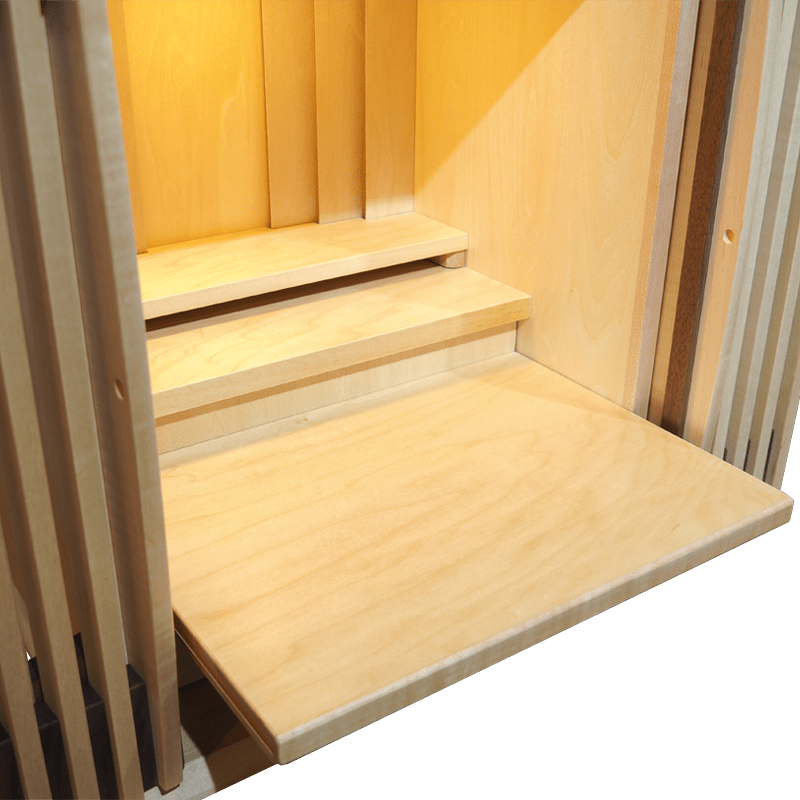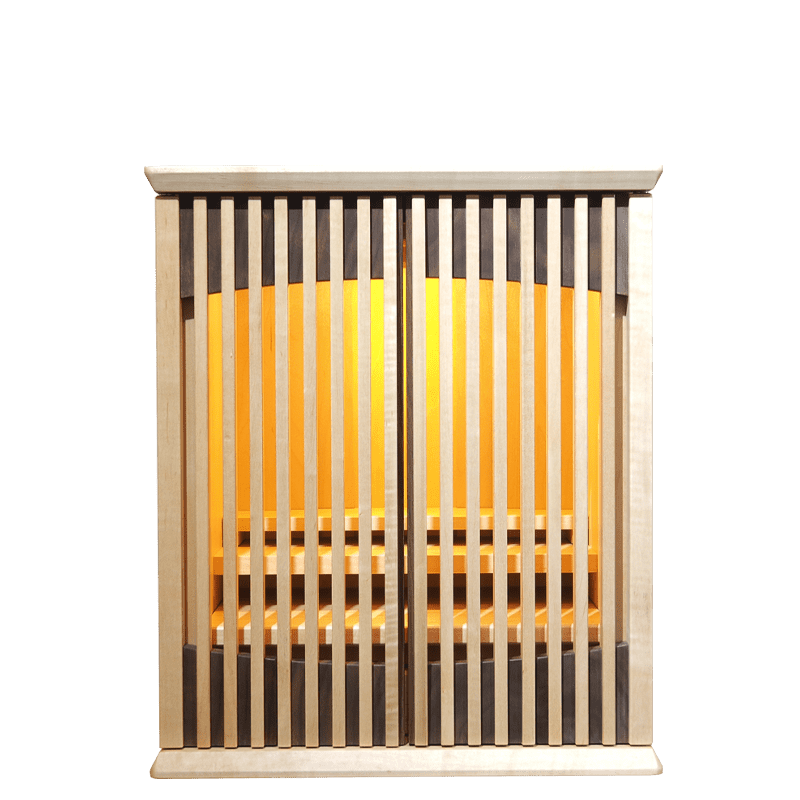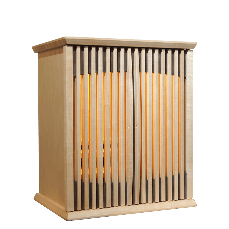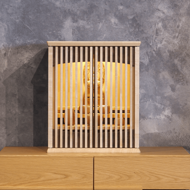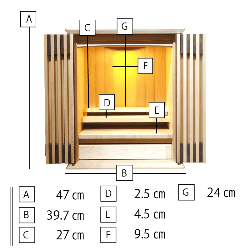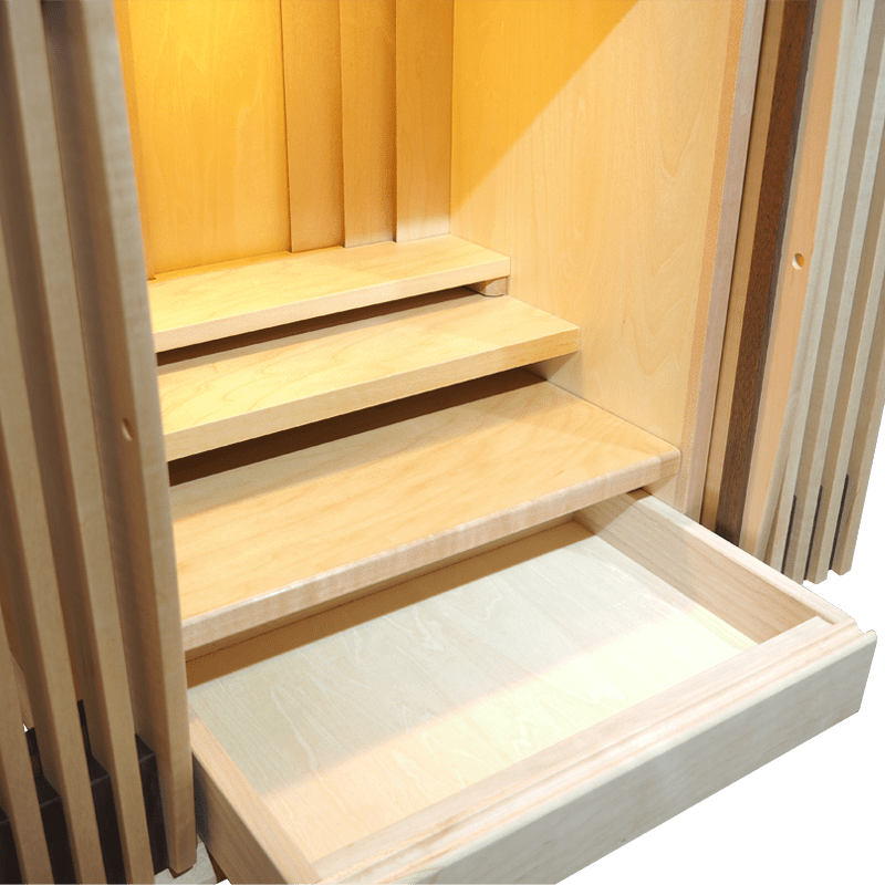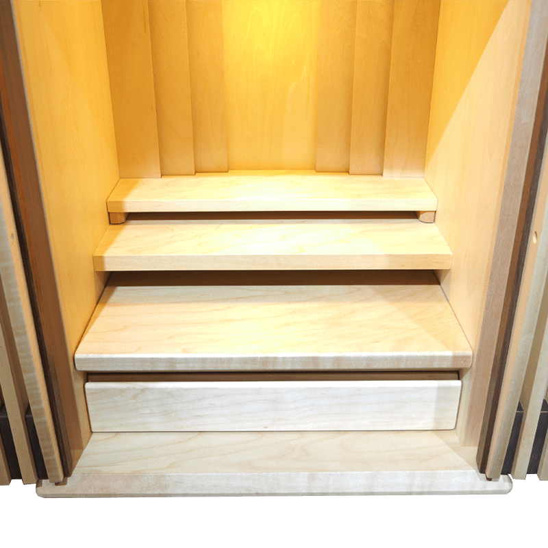 ウォールナットと楓の絶妙なバランスで組み合わさり、明るさと、落ち着きのあるおしゃれな仏壇。扉を閉めても透格子扉の為ご本尊様の姿も見え、ご家族を優しく見守ってくれています。背板裏のLEDの間接照明と天井のLED照明が備わっており、より洗練された祈りの空間を演出していただけます。スライド式の膳引きや小物を収納できる引き出しも備わっておりますので機能性も抜群です。