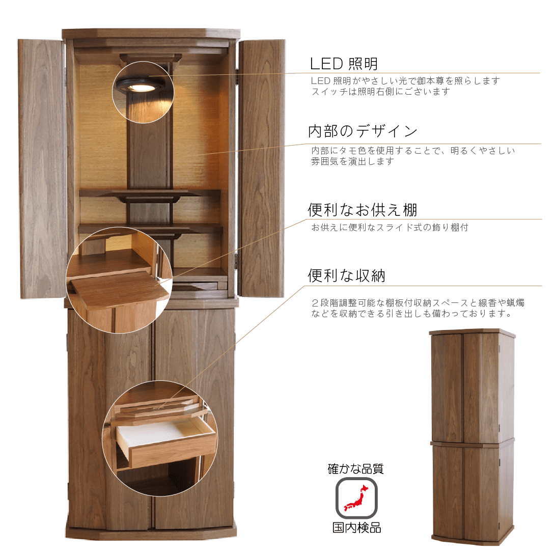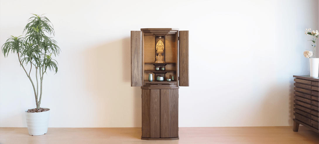 シックなウォールナットカラーは和モダンにも現代リビングにも調和します。内部のタモ色とのバイカラーが優しくおしゃれな雰囲気を演出します。椅子に腰かけて拝める130㎝のモダン仏壇です。