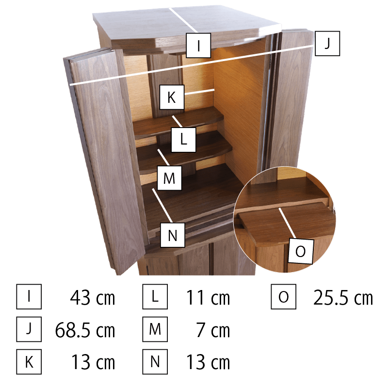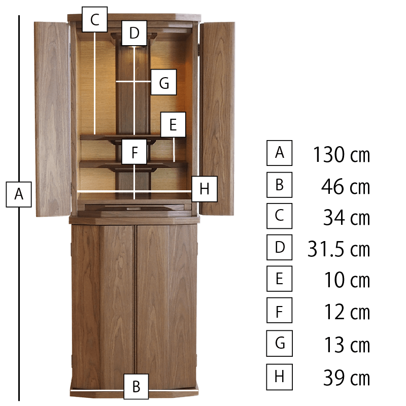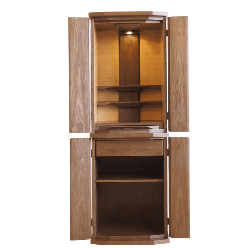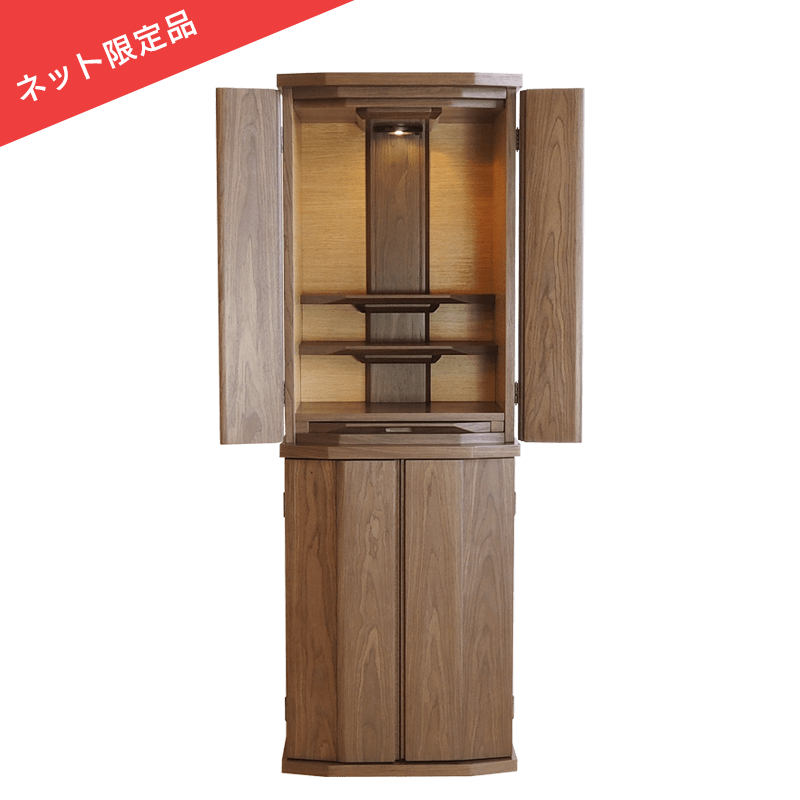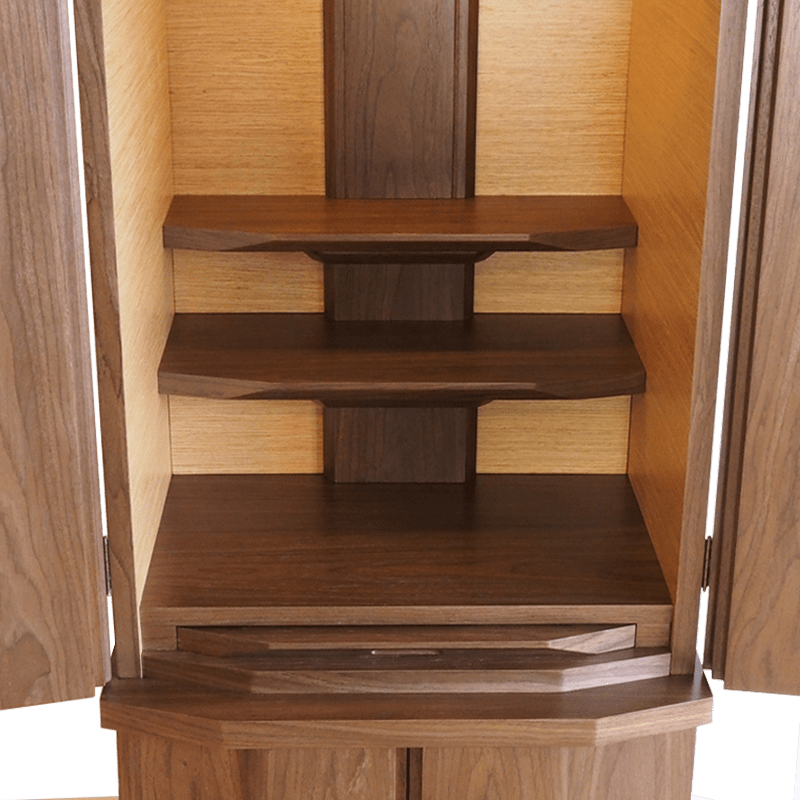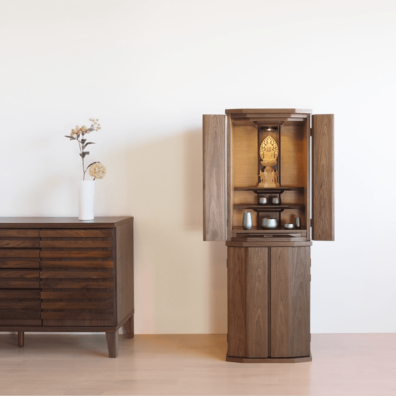 シックなウォールナットカラーは和モダンにも現代リビングにも調和します。内部のタモ色とのバイカラーが優しくおしゃれな雰囲気を演出します。椅子に腰かけて拝める130㎝のモダン仏壇です。