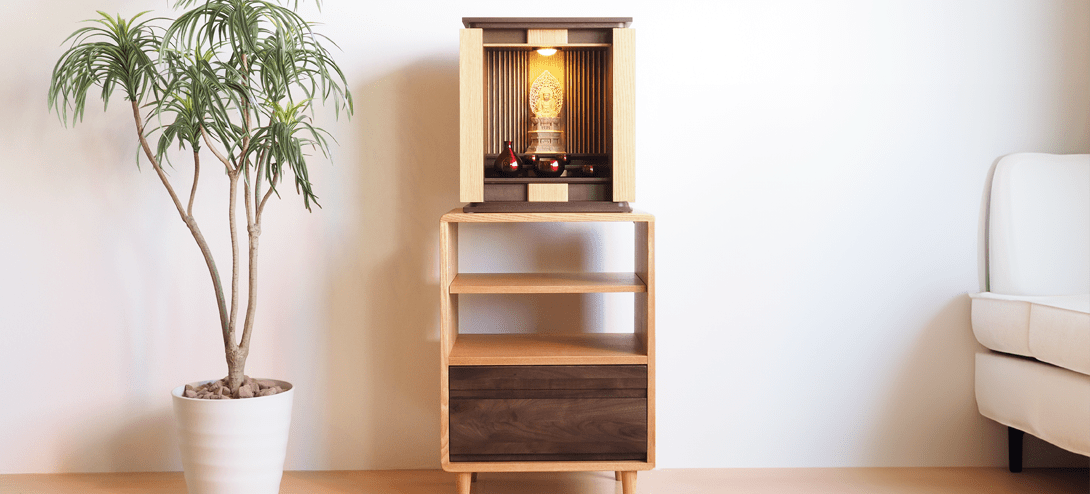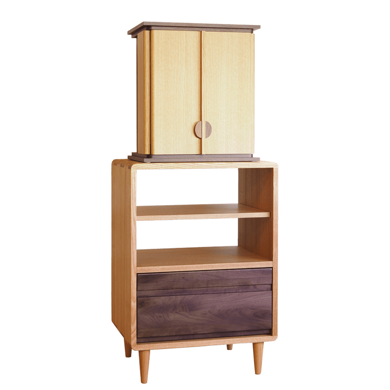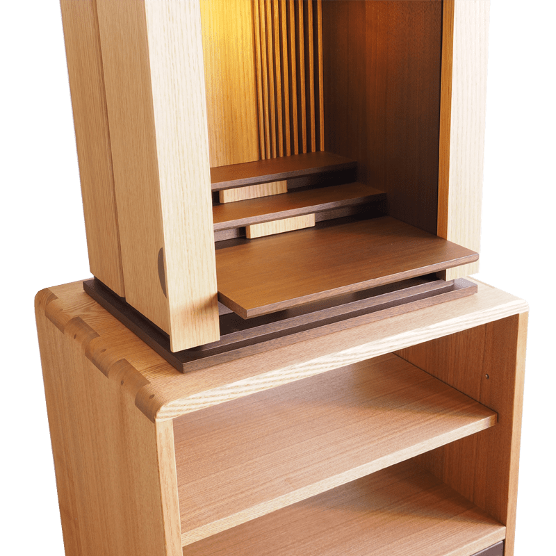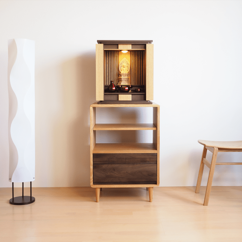 上下2トーンカラーのおしゃれで可愛らしい2way仏壇。仏壇は押込み式のスライド扉でデッドスペースが無く、スタイリッシュに設置されています。チェストは透けた棚が珍しく、故人様の遺品やお花、写真などを飾る事もでき、祈りの空間にそっと寄り添いお祀りすることが出来ます。下には引き出しも備わっており、仏事で利用の物なども収納できます。チェストのみでインテリアとしての利用も多い商品です。