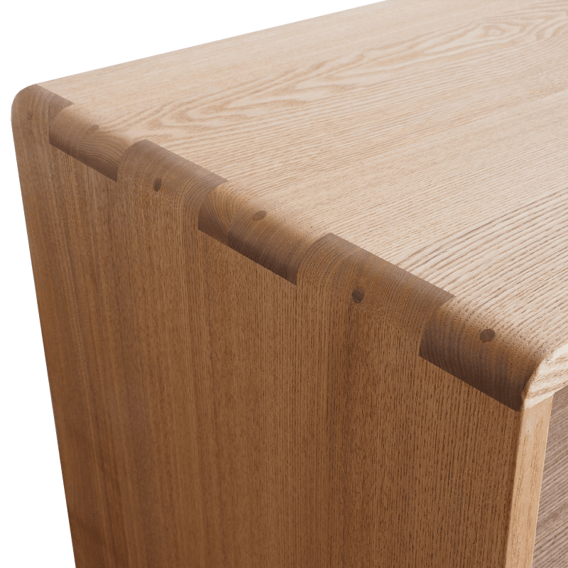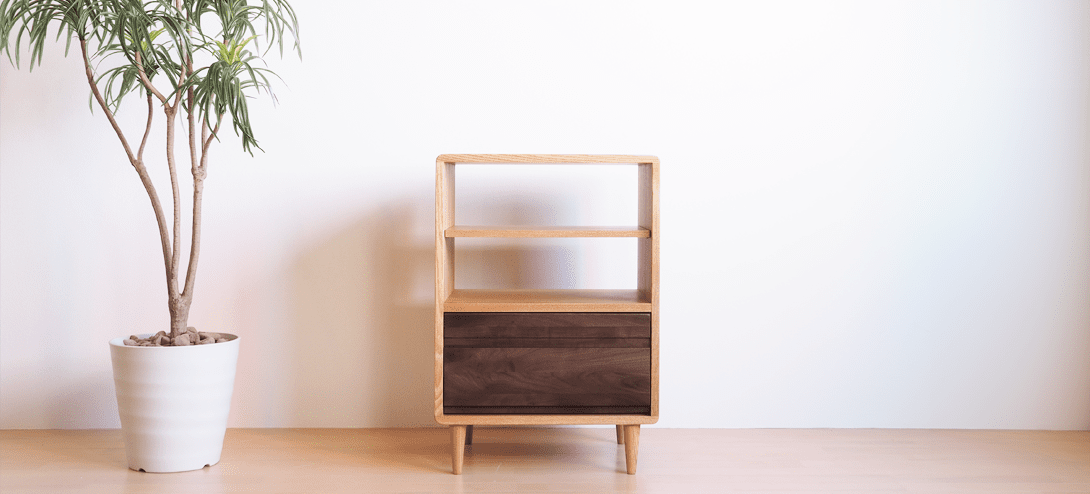 タモ材とウォールナット材を組み合わせたおしゃれなチェスト。 高級家具などに使われてきたブラックウォールナットの木。このウォールナット材をアクセントに使用し、ライト色の優しい木肌のタモの無垢材と合わせることで、印象的な2トーンデザインに仕上がっています。堅牢な板の継ぎ目が本格派の印象を与えてくれ、角は丸く仕上げた安全設計なので小さなお子様がいらっしゃるご家庭にもおすすめです。