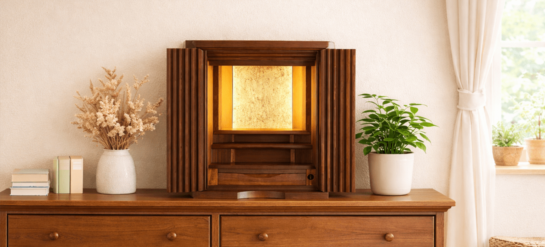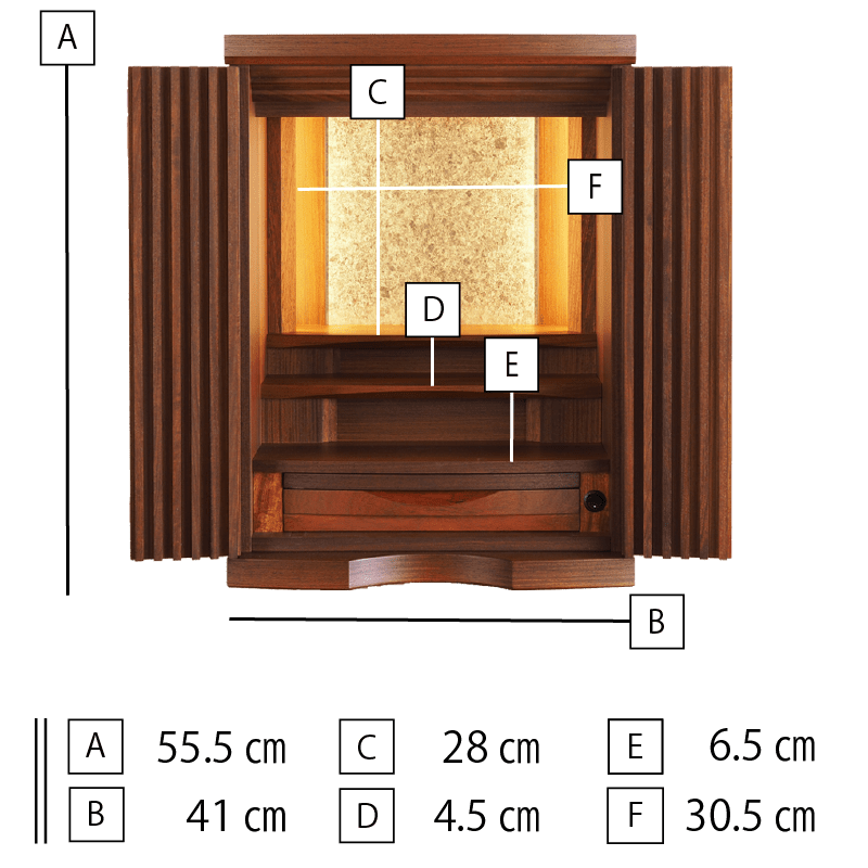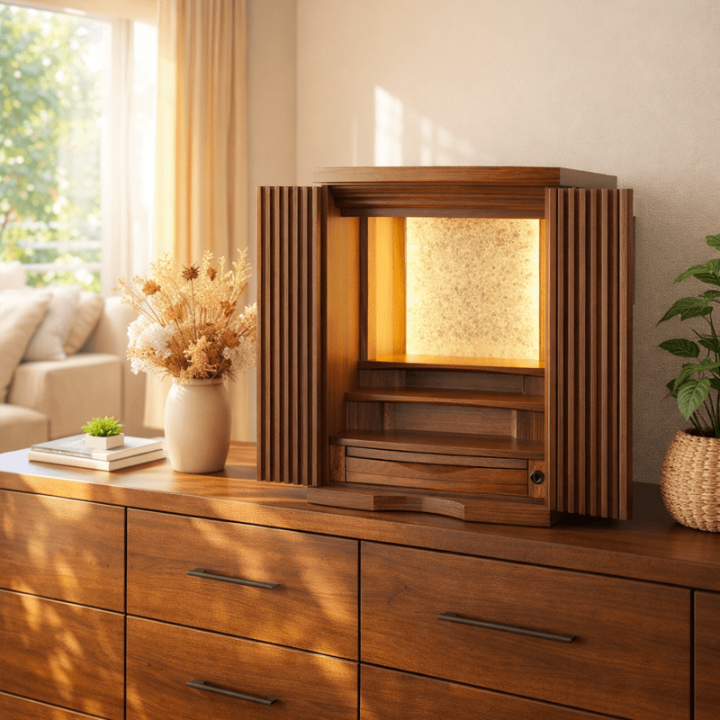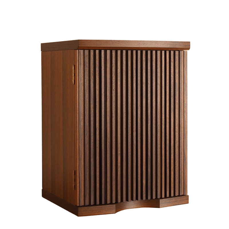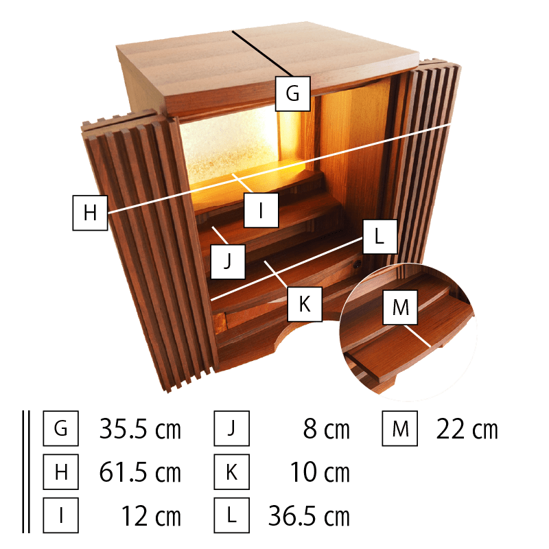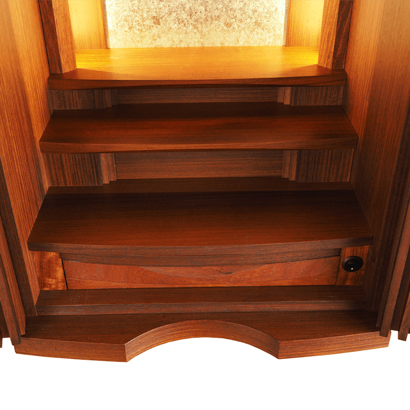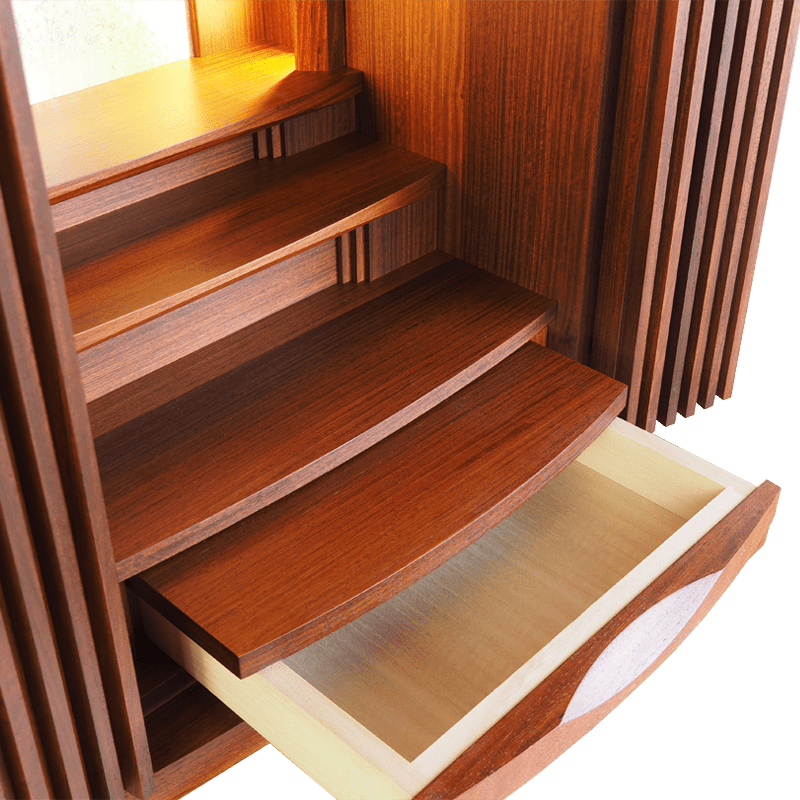 格子の扉が曲面を描き細部にまでこだわりが詰まった美しいコンパクト仏壇。内部には間接照明を施し、ご本尊様がおしゃれに演出されます。花梨の少し赤みがかかった色合いはウォールナットの家具などとの相性も良く、インテリアに合わせて設置可能。