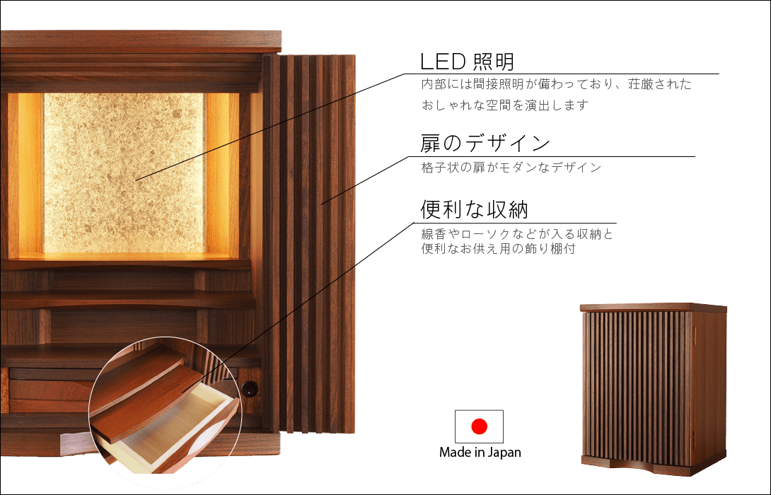 徳島からは仏壇製作技術を活かした高性能でデザイン性の高いモダン仏壇をお届けします。