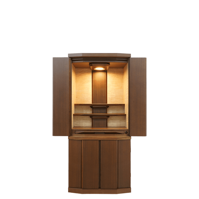 シックなウォールナットを基調に内部をメープルで仕上げる事で、やさしい雰囲気が御本尊をあたたかく包み込みます。天井や棚部分まで六角形状で統一したデザインが上品です。ワイド設計の為内部が広くお給仕がしやすい、経机付の日本製デザイナーズモダン仏壇です。