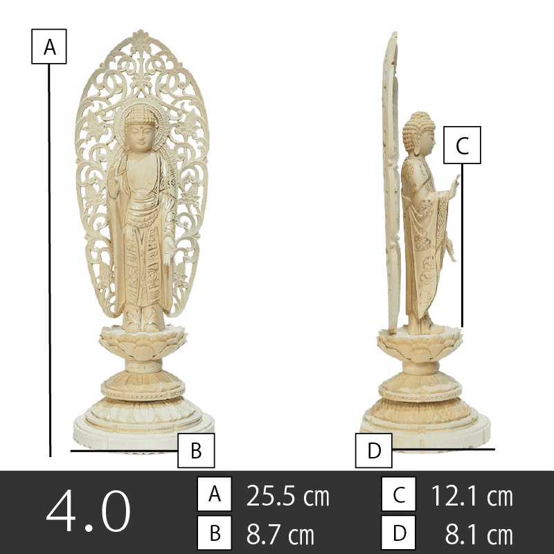 | サイズ | 3.0寸 総高:19.5cm 台幅:6.6cm 奥行:6.3cm 3.5寸 総高:22.7cm 台幅:7.7cm 奥行:7.2cm 4.0寸 総高:25.5㎝ 台幅:8.7㎝ 奥行:8.1㎝ 4.5寸 総高:28.1㎝ 台幅:10.1㎝ 奥行:9.5㎝ 5.0寸 総高:31.3cm 台幅:10.9cm 奥行:10cm |