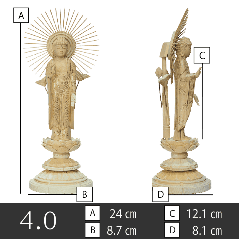 | サイズ | 3.0寸 総高:19cm 台幅:6.6cm 奥行:6.3cm 3.5寸 総高:21.6cm 台幅:7.8cm 奥行:7.2cm 4.0寸 総高:24㎝ 台幅:8.7㎝ 奥行:8.1㎝ 4.5寸 総高:26.6㎝ 台幅:10.1㎝ 奥行:9.5㎝ 5.0寸 総高:30cm 台幅:10.8cm 奥行:10cm |
