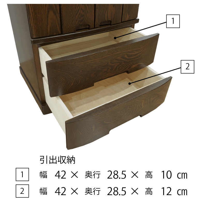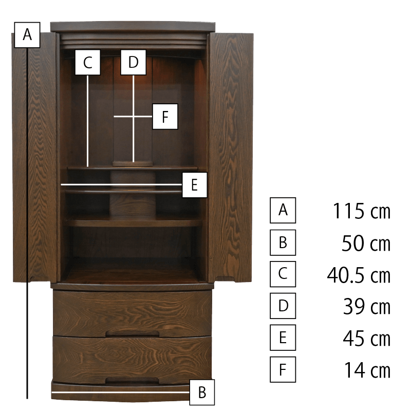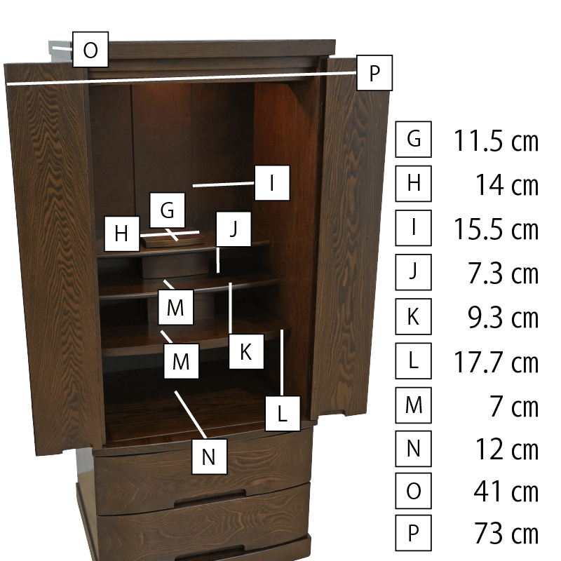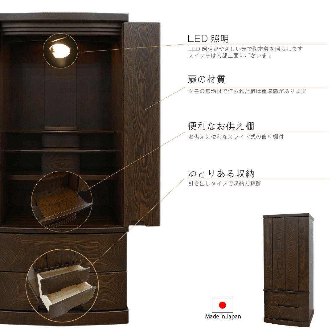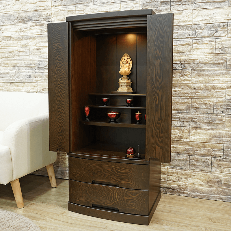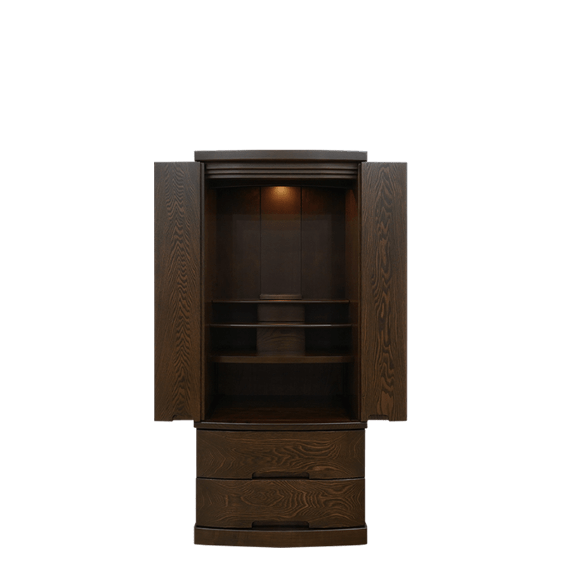正座した時に手を合わせやすいサイズ感と内部の広さが魅力のお値打ちモダン仏壇。扉は無垢材で製作しており下台は大きな引き出しが2つ備わり収納力抜群の日本製仏壇です。