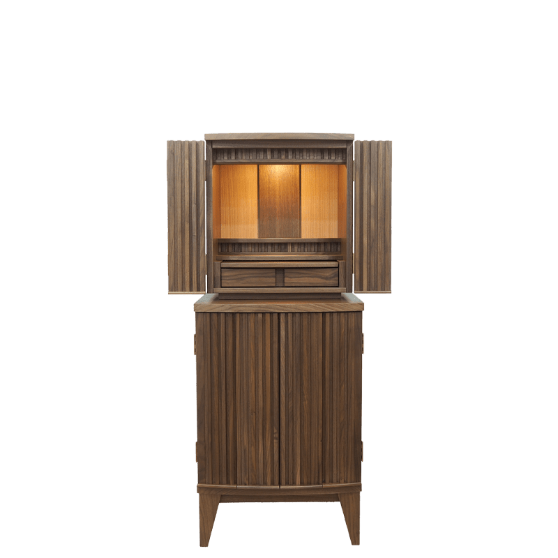 丸みを帯びた柔らかさと格子のバランスが高級感を演出する2WAY仏壇。おしゃれな格子のデザインは見る人の心を落ち着かせて、あたたかさとぬくもりのある祈りの空間を与えてくれます。さらに圧迫感のない4本の脚がより仏壇をスマートでモダンに魅せます。将来的にお仏壇とチェストを別々で使用できる造りになっております。