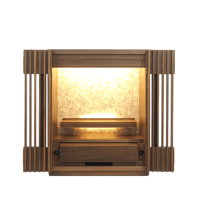 ウォールナットの無垢材を使用し、透格子のデザインで扉を閉めても内部の空間が見え、ご本尊様にいつも見守っていただけます。 まるで空中に浮いているようなモダンな須弥壇で間接照明を上手く施しておしゃれで荘厳された祈りの空間を演出しています。背板のデザインも現代的なデザインでスマートに内部を魅せます。 小物入れの引き出しや膳引きも備わっております。