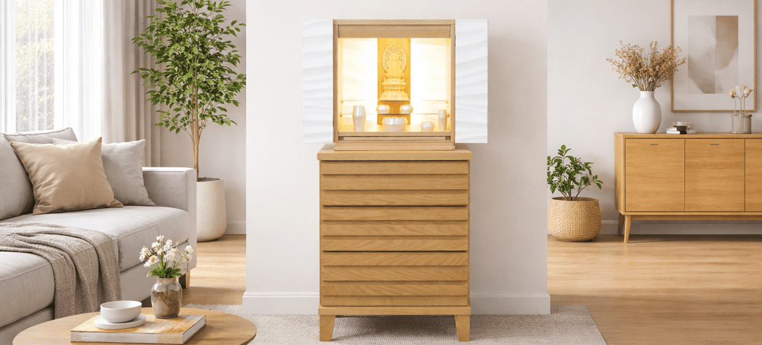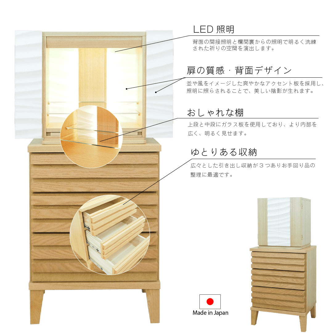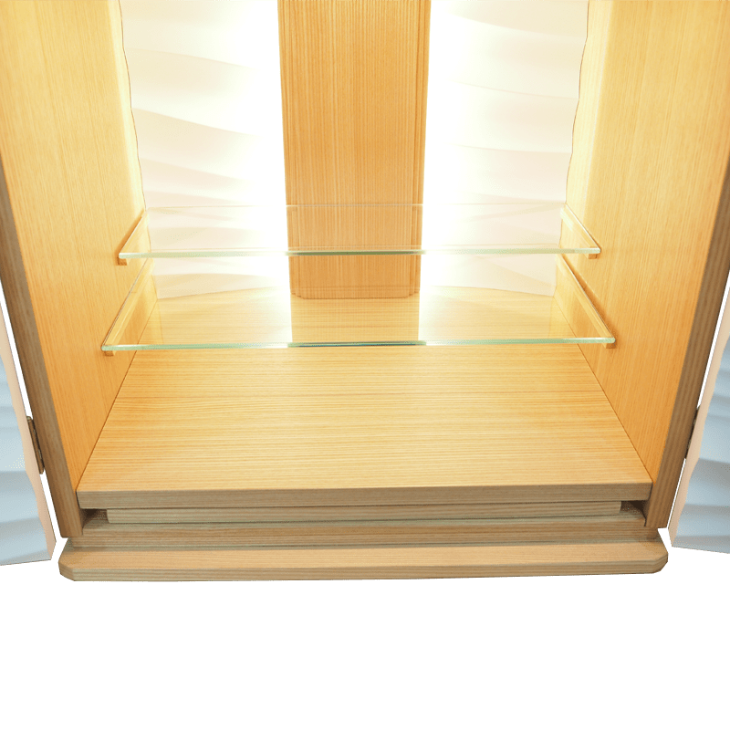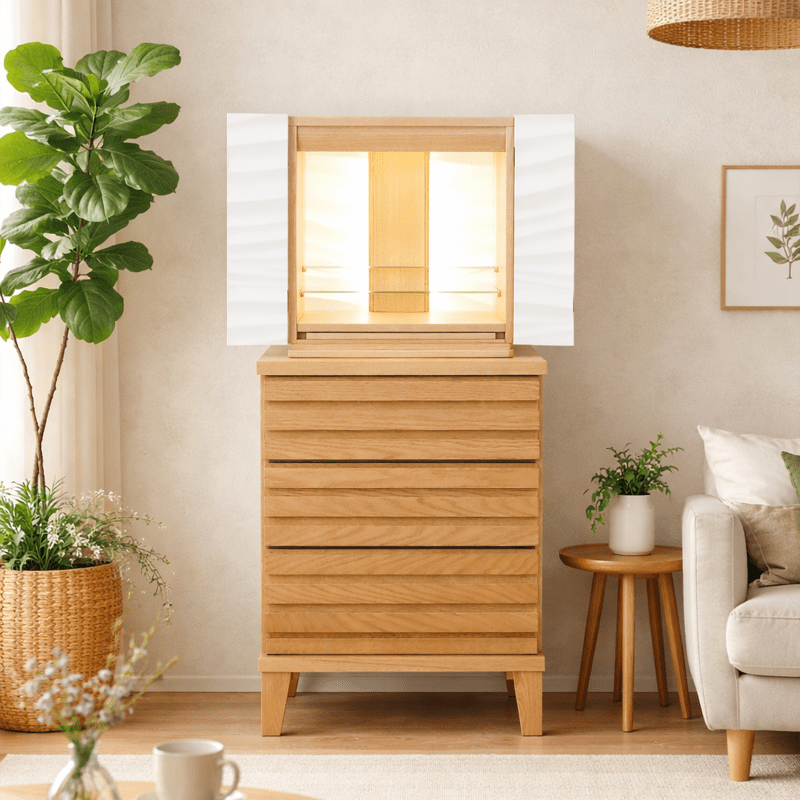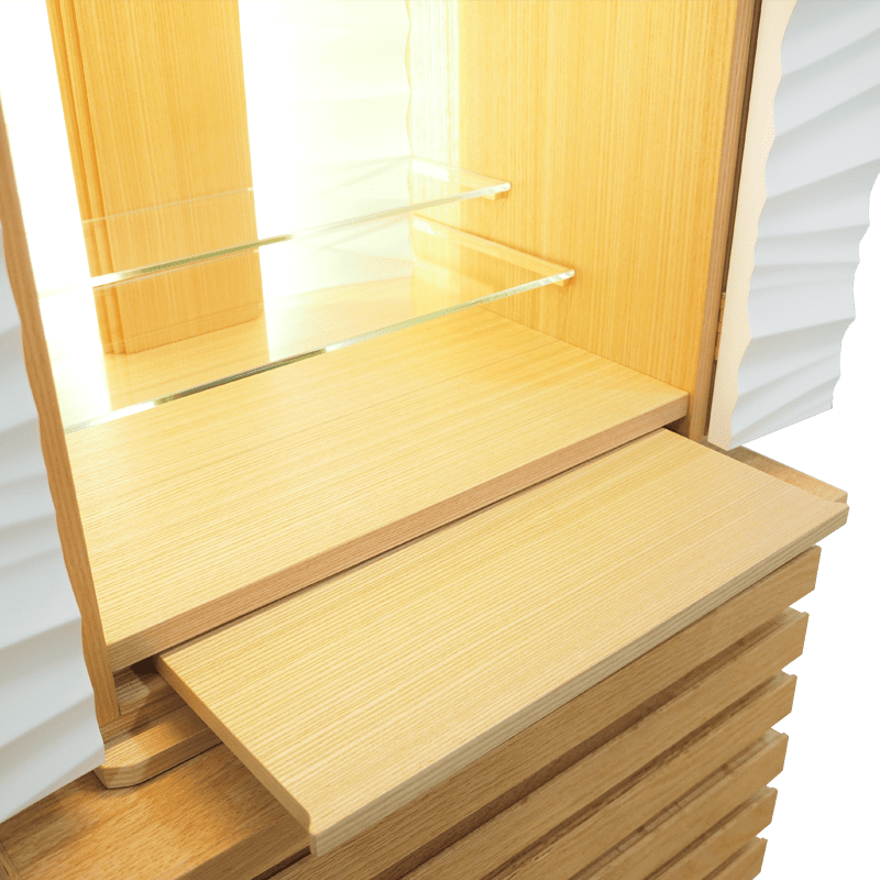 波や風をイメージした爽やかなアクセント板を採用し、内部の間接照明に照らされると美しい陰影が生まれます。内部の棚にはガラス板を使用しているため、広く明るい祈りの空間を演出しています。チェストにはレッドオークの無垢材に天然オイルを施した質感の高い仕上げのlouver530を合わせた、モダンデザインのSTYLEです。