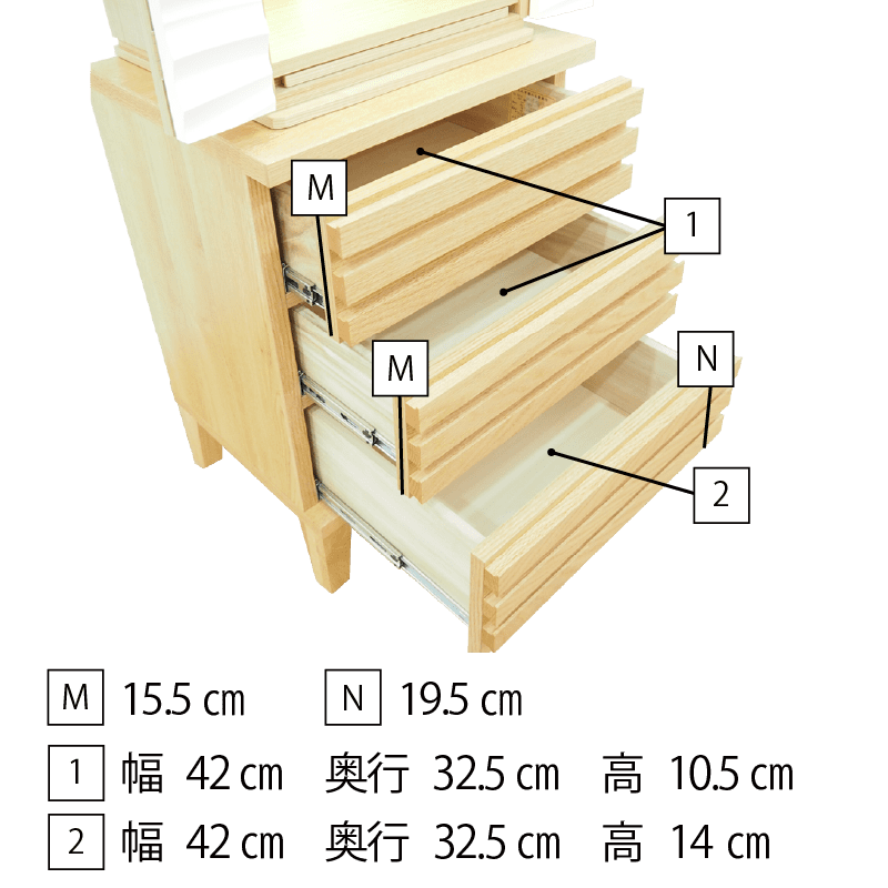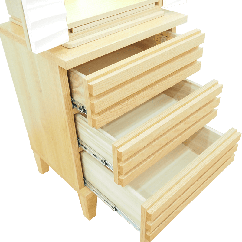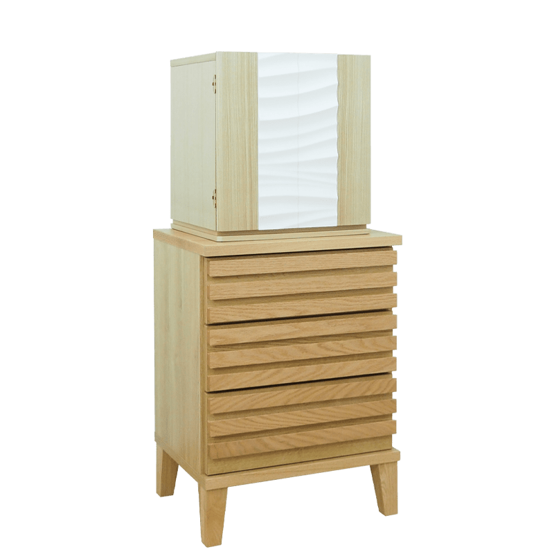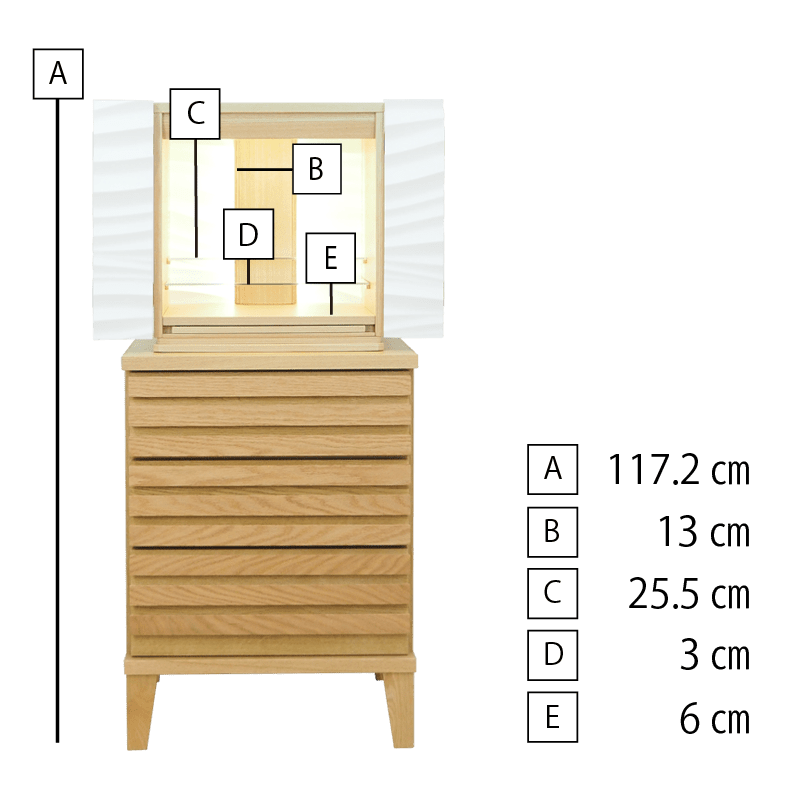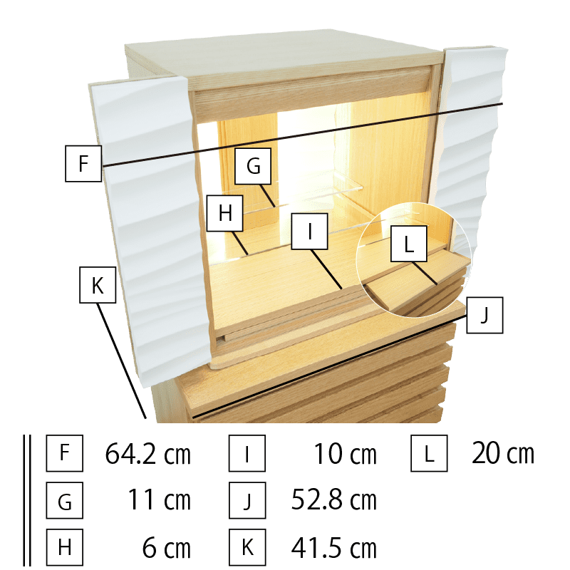 波や風をイメージした爽やかなアクセント板を採用し、内部の間接照明に照らされると美しい陰影が生まれます。内部の棚にはガラス板を使用しているため、広く明るい祈りの空間を演出しています。チェストにはレッドオークの無垢材に天然オイルを施した質感の高い仕上げのlouver530を合わせた、モダンデザインのSTYLEです。